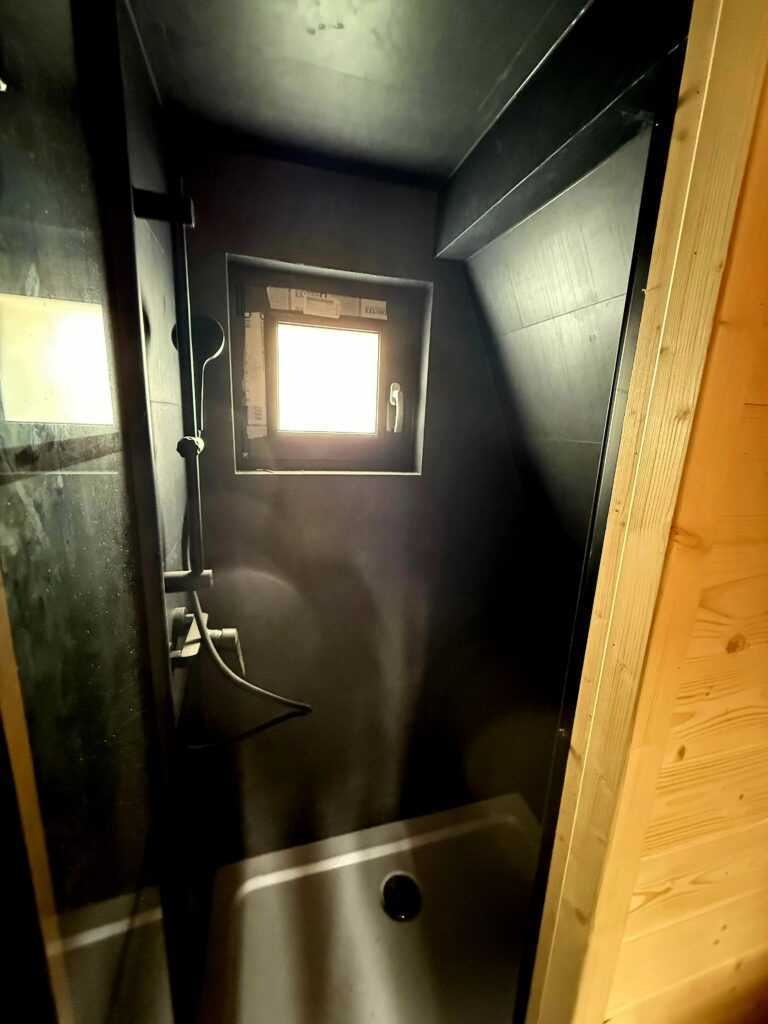 Na parterze domku BRDA znajduje się przestronny salon z aneksem kuchennym oraz łazienka, co zapewnia wygodę codziennego użytkowania.