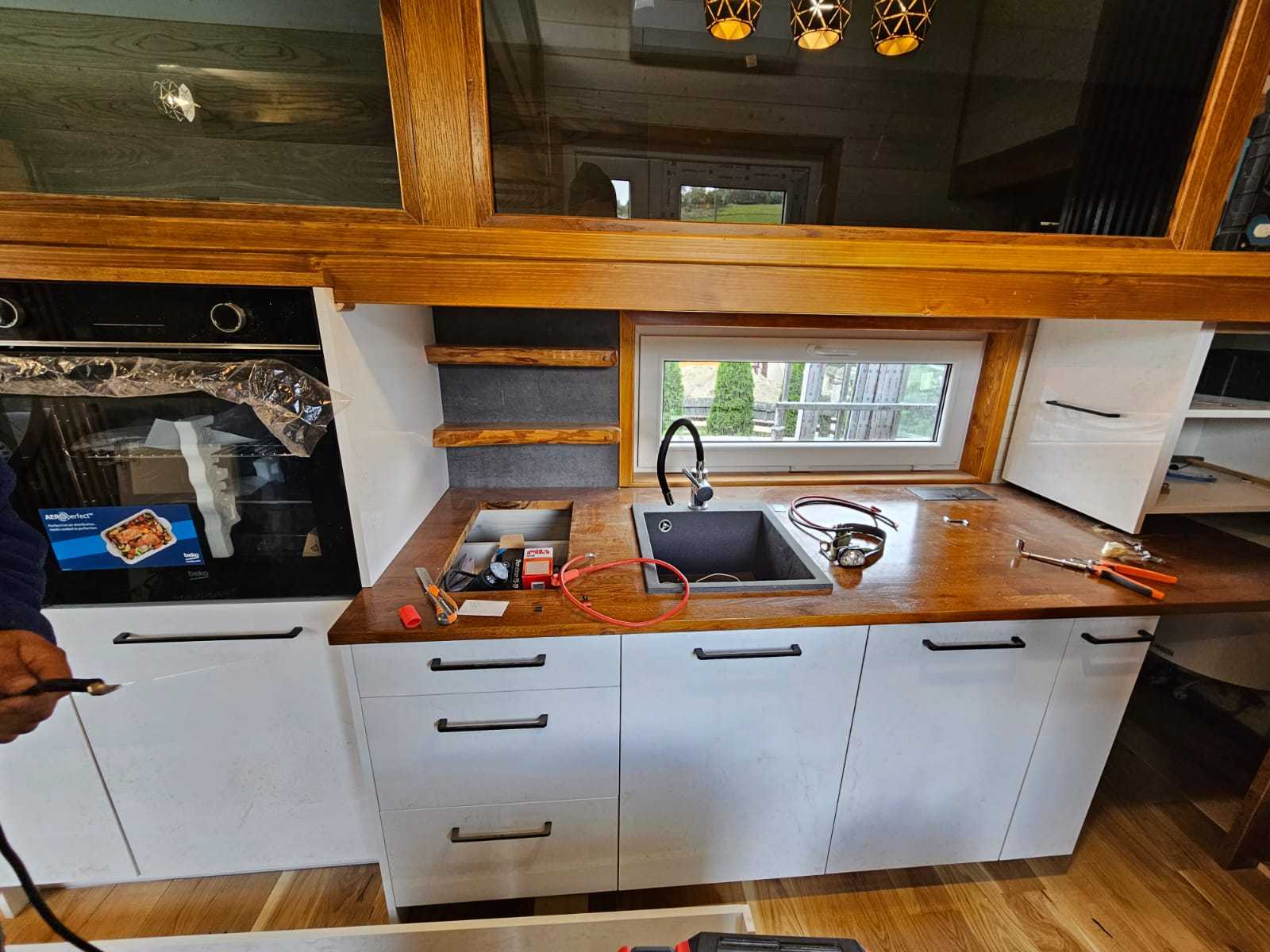 • Białe meble kuchenne – dodatki elementy drewna – czarne uchwyty